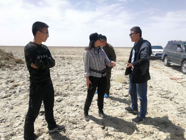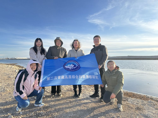 2024年11月25日,王建萍(右三)和科研團(tuán)隊在鹽湖進(jìn)行野外考察。