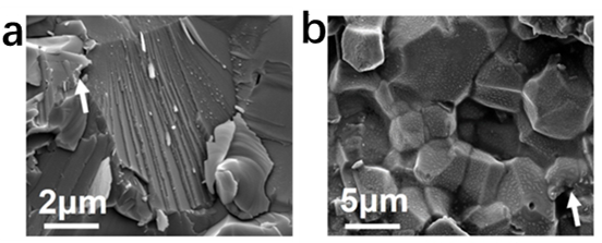 低溫 400℃ 下穿晶斷裂(a)和高溫 800℃ 下沿晶斷裂(b)特征 圖片來(lái)源:蘭州化物理所