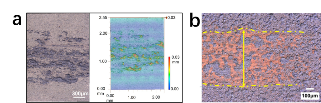 1000℃ 下摩擦 30 min(a)和 1000℃ 下摩擦 180 min(b)后材料磨損表面形態(tài) 圖片來(lái)源:蘭州化物所