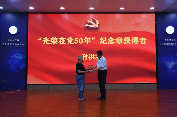 會議第二階段,在雄壯的國歌聲中,西北高原所召開慶祝建黨103周年表彰大會。楊勇剛宣讀了《中共中國科學院西北高原生物研究所委員會關于表彰先進黨支部、優(yōu)秀共產黨員和優(yōu)秀黨務工作者的決定》。首先,所長陳世龍向孫洪發(fā)同志頒發(fā)“光榮在黨50年”紀念章,代表所黨委向孫洪發(fā)同志表示祝賀,并對他多年來為黨的事業(yè)盡心竭力、無私奉獻致以崇高的敬意。