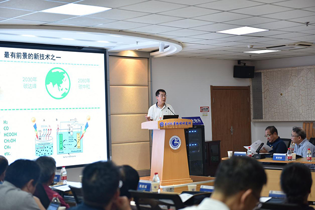蘭州化物所副所長(zhǎng)、黨委委員石峰作了題為“西部地區(qū)資源能源結(jié)構(gòu)與國(guó)家‘雙碳戰(zhàn)略’”的主旨報(bào)告。介紹了我國(guó)碳捕捉、利用與封存技術(shù)(CCUS)的發(fā)展與應(yīng)用,分享了二氧化碳生物利用技術(shù)的綠色生態(tài)理念,就國(guó)家“雙碳戰(zhàn)略”和西部地區(qū)資源能源結(jié)構(gòu)進(jìn)行了深入探討。他強(qiáng)調(diào),我國(guó)西部地區(qū)太陽(yáng)能、風(fēng)能等清潔能源豐富,要積極響應(yīng)國(guó)家號(hào)召,著力解決石化工業(yè)供需不匹配、低碳生產(chǎn)工藝技術(shù)自主創(chuàng)新能力不足等問(wèn)題。甘肅省飛天學(xué)者特聘教授、蘭州大學(xué)化學(xué)化工學(xué)院丁勇教授作了題為“分子催化劑光催化水分解以及二氧化碳還原研究”的特邀報(bào)告。重點(diǎn)介紹了光催化分解水技術(shù)和二氧化碳光催化還原在實(shí)現(xiàn)碳達(dá)峰、碳中和的研究進(jìn)展,討論了二氧化碳光催化轉(zhuǎn)化存在可見(jiàn)光區(qū)吸收弱、分離難轉(zhuǎn)移慢、析氫反應(yīng)等制約發(fā)展的關(guān)鍵問(wèn)題,分享了其團(tuán)隊(duì)合成了多氧鎢酸鹽節(jié)點(diǎn)的金屬-有機(jī)籠等特定結(jié)構(gòu)的催化劑,并采用引入普魯士藍(lán)類(lèi)似物作為助催化劑等方法更高效地實(shí)現(xiàn)了光催化的二氧化碳還原。