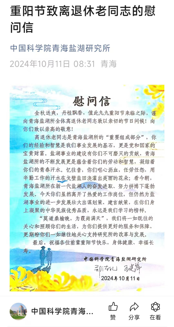 歡度重陽節(jié),共敘夕陽情。本次重陽節(jié)活動不僅讓離退休職工在美景、詩詞和美食中度過了一個愉快的節(jié)日,更讓他們感受到了研究所與社會的關(guān)愛和尊重。青海鹽湖所將一如既往地關(guān)心、關(guān)愛離退休老同志,讓他們安享幸福美滿晚年,不斷傳遞尊老敬老正能量,為構(gòu)建和諧社會貢獻(xiàn)力量。