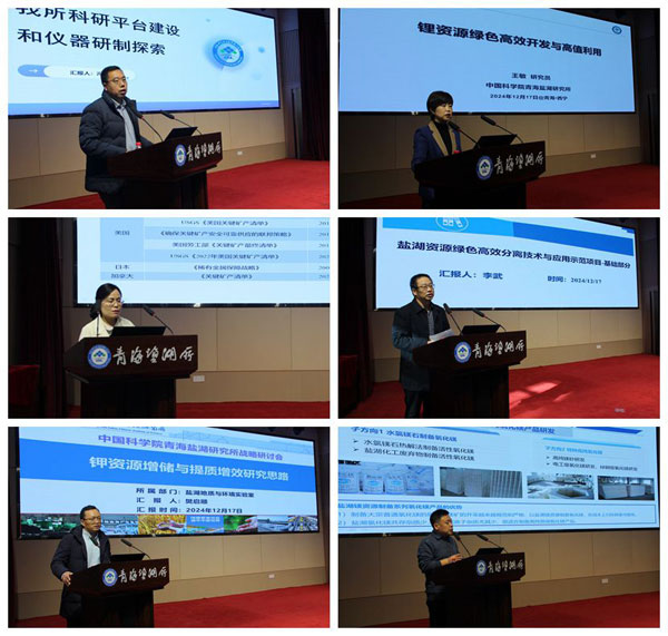 大會開始,鄭詩禮副所長(主持工作)首先介紹了召開此次戰(zhàn)略研討會的背景和意義。隨后,李武研究員、樊啟順研究員、王敏研究員、葉秀深研究員、劉海寧研究員及副所長馮海濤研究員圍繞鹽湖化學(xué)基礎(chǔ)研究、鉀資源增儲、鋰高效分離、鎂基結(jié)構(gòu)材料、鹽湖稀散元素和儀器設(shè)備平臺開發(fā)六個方向分別以《鹽湖資源綠色高效分離技術(shù)與應(yīng)用示范項目-基礎(chǔ)部分》《鉀資源增儲與提質(zhì)增效研究思路》《鋰資源綠色高效開發(fā)與高值利用》《強(qiáng)化關(guān)鍵科學(xué)與技術(shù)攻關(guān)加快推動鹽湖鎂產(chǎn)業(yè)多元化高值化發(fā)展》《鹽湖銣銫溴碘硼高值元素資源增儲與分離提取》《青海鹽湖所科研平臺建設(shè)與儀器研制探索》為題作報告。