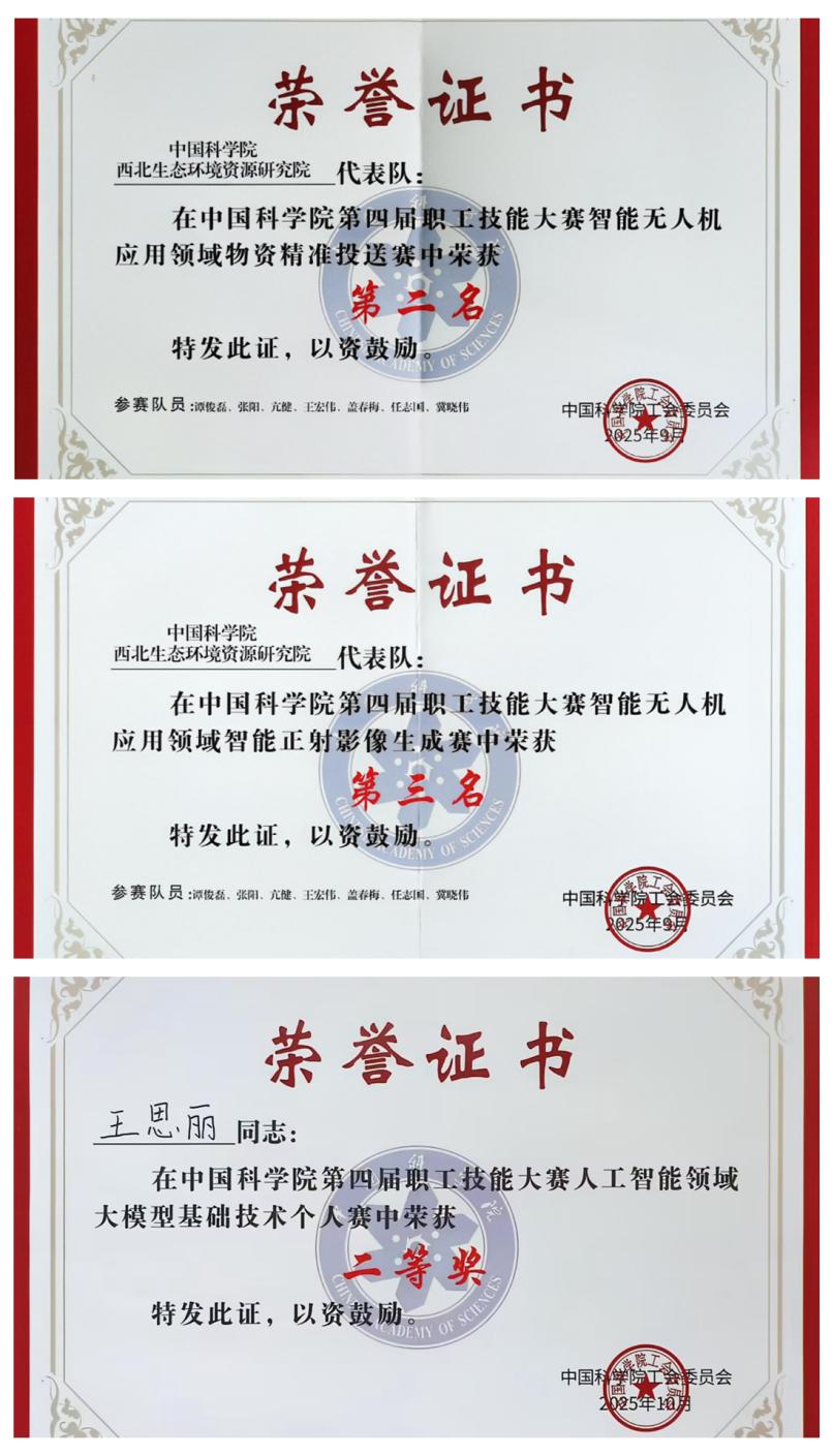 在西北研究院黨委的高度重視與工會(huì)的精心組織下,科研團(tuán)隊(duì)積極響應(yīng)、踴躍參賽。智能無(wú)人機(jī)應(yīng)用領(lǐng)域,由黑河遙感試驗(yàn)研究站譚俊磊、亢健、張陽(yáng)等6名選手組成的團(tuán)隊(duì)通過(guò)精準(zhǔn)路徑規(guī)劃與動(dòng)態(tài)負(fù)載調(diào)控,實(shí)現(xiàn)復(fù)雜環(huán)境下物資的穩(wěn)定投送,依托自研靶標(biāo)識(shí)別程序,顯著提升正射影像數(shù)據(jù)處理效率,榮獲了“物資精準(zhǔn)投送”賽道全院第二名,“智能正射影像生成”賽道全院第三名和團(tuán)隊(duì)三等獎(jiǎng)。在網(wǎng)信智能應(yīng)用服務(wù)領(lǐng)域,國(guó)家冰川凍土沙漠科學(xué)數(shù)據(jù)中心團(tuán)隊(duì)將專業(yè)領(lǐng)域數(shù)據(jù)和服務(wù)能力與AI的強(qiáng)大分析推理能力結(jié)合,實(shí)現(xiàn)自然語(yǔ)言交互、數(shù)據(jù)智能分析和可視化展示,提升了數(shù)據(jù)中心的智能化服務(wù)水平,榮獲了“MCP云服務(wù)”賽道三等獎(jiǎng)。在人工智能領(lǐng)域,文獻(xiàn)情報(bào)中心王思麗基于中國(guó)科學(xué)院 “磐石?科學(xué)基礎(chǔ)大模型”,圍繞人工智能基礎(chǔ)理論、實(shí)操能力與知識(shí)融合推理能力展開(kāi)角逐,榮獲“大模型基礎(chǔ)技術(shù)個(gè)人賽”二等獎(jiǎng)。