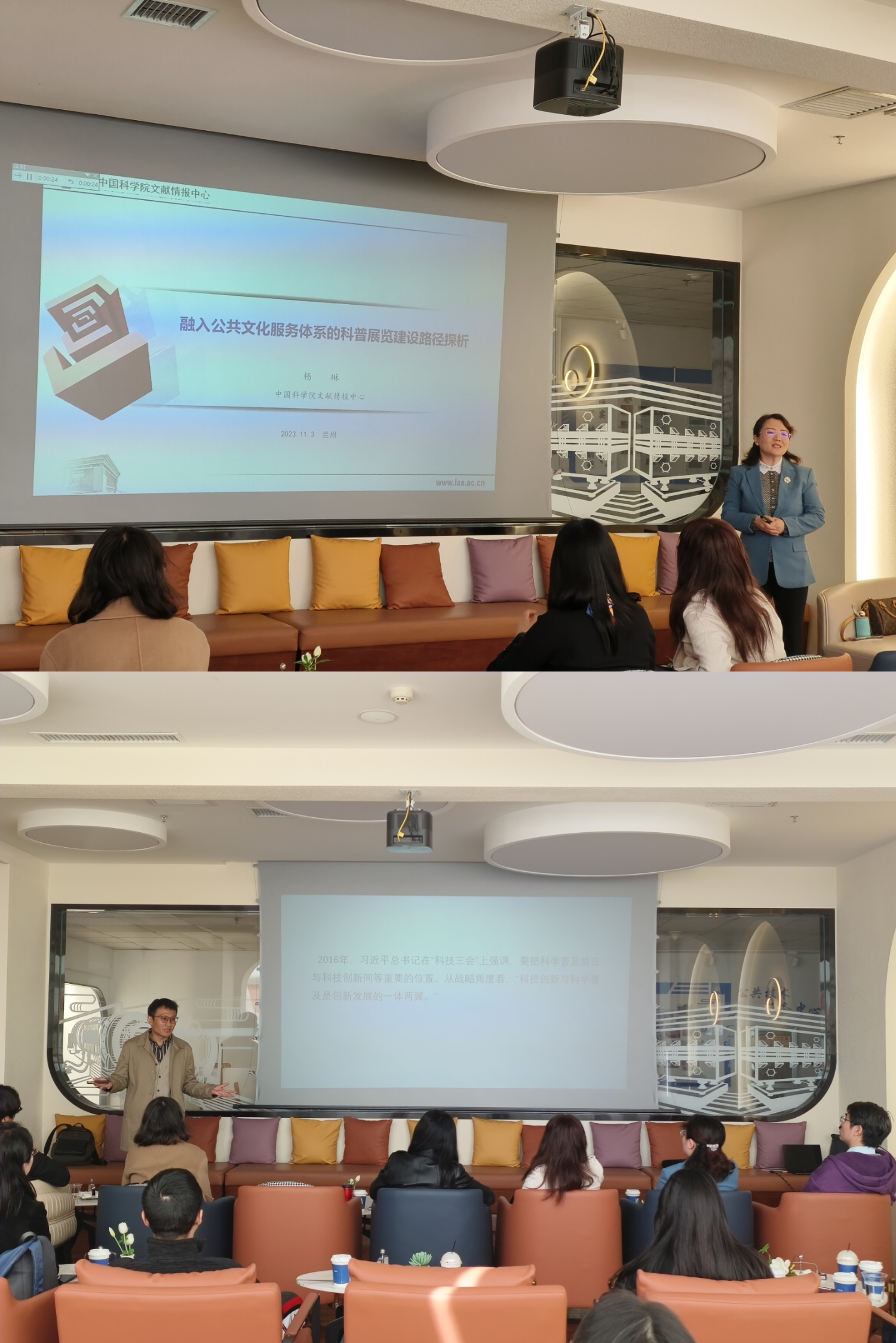 此次培訓(xùn)邀請到來自中國科學(xué)院文獻(xiàn)情報中心智能情報重點實驗室副主任楊琳研究館員和來自蘭州大學(xué)趙序茅研究員分別作題為“融入公共文化服務(wù)體系的科普展覽建設(shè)路徑探析”和“科普的三重境界”的專題報告。楊琳闡述了科普化表達(dá)創(chuàng)新成果和“真、善、美”描寫科學(xué)家是科普展覽融入公共文化服務(wù)體系的路徑;趙序茅闡述了科普的知識導(dǎo)向、思維導(dǎo)向、價值導(dǎo)向以及科普寫作應(yīng)具有科學(xué)性、傳播性和思想性。