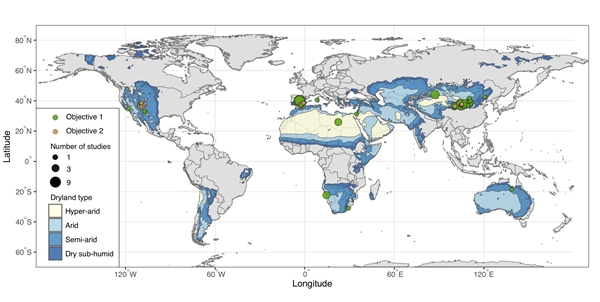 圖1 全球干旱區(qū)分布圖和元分析中使用的研究地點(diǎn)