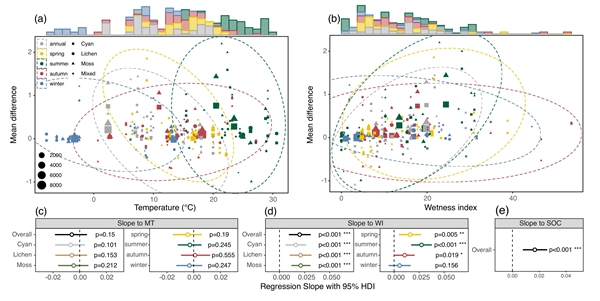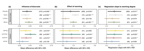 中國科學(xué)院西北生態(tài)環(huán)境資源研究院寧夏沙坡頭沙漠生態(tài)系統(tǒng)國家野外科學(xué)觀測研究站(以下簡稱沙坡頭站)科研團(tuán)隊(duì)聯(lián)合國內(nèi)外多個(gè)研究團(tuán)隊(duì),以干旱區(qū)生物土壤結(jié)皮為研究對象,對干旱區(qū)生物結(jié)皮調(diào)節(jié)土壤NSE的地理分布規(guī)律進(jìn)行深入研究。科研人員采用貝葉斯層次化元分析(Bayesian hierarchical Meta-analysis),分別對47項(xiàng)和23項(xiàng)已發(fā)表研究成果進(jìn)行綜合評估,揭示了生物結(jié)皮對土壤NSE和實(shí)驗(yàn)性增溫對生物結(jié)皮NSE的顯著影響。元回歸進(jìn)一步探索了生物結(jié)皮NSE的溫度和濕度敏感性以及對氣候變化的潛在適應(yīng)。
