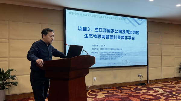 中國科學院三江源國家公園研究院研究員趙亮匯報“三江源國家公園及周邊地區(qū)生態(tài)物聯(lián)網(wǎng)管理科普數(shù)字平臺”項目情況