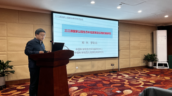 中國科學院生態(tài)環(huán)境研究中心研究員鄭華匯報“三江源國家公園生態(tài)補償政策及實施機制研究”項目情況