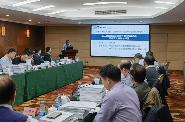 中國科學院西北生態(tài)環(huán)境資源研究院研究員陳仁升匯報“三江源區(qū)流域水源涵養(yǎng)能力和水系統(tǒng)動態(tài)變化監(jiān)測與評估”項目情況