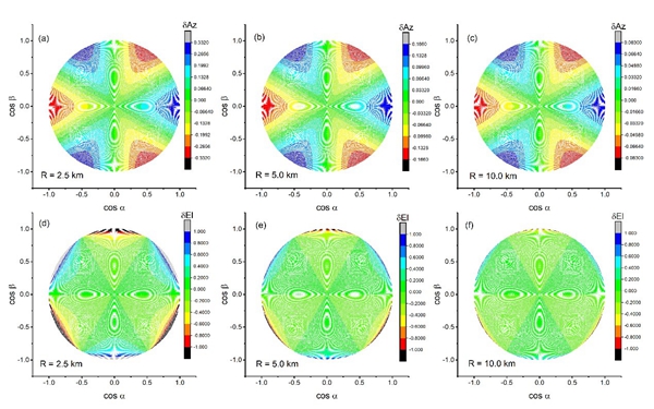 圖1 在改進的等邊三角形基線情況下,不同距離上輻射源定位系統(tǒng)誤差在余弦投影平面上的分布情況。(a) - (c) 分別對應(yīng)于2.5公里、5公里和10公里觀測距離的方位誤差;(d) - (f) 分別對應(yīng)于2.5公里、5公里和10公里觀測距離的仰角誤差