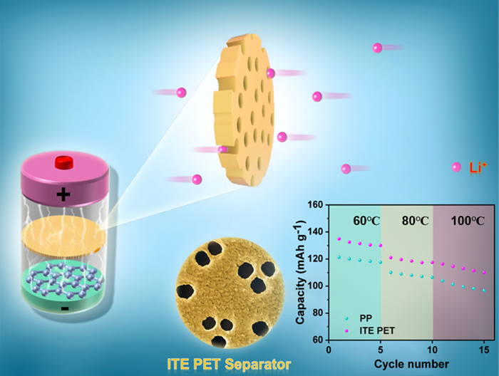 科研人員借助蘭州重離子研究裝置(HIRFL),將重離子輻照技術(shù)與化學(xué)蝕刻工藝相結(jié)合,以PET(聚對苯二甲酸乙二醇酯)膜為基材,成功開發(fā)一種PET基耐高溫鋰離子電池隔膜。該鋰離子電池隔膜相較于商業(yè)聚烯烴隔膜,不僅具有更加均一的孔徑分布和更優(yōu)異的電解液潤濕性,而且所制備的PET隔膜表現(xiàn)出良好的耐高溫性能(熱收縮率小于3%@180 )。電池測試結(jié)果表明,PET隔膜具有更高的鋰離子遷移數(shù)(0.59)以及優(yōu)異的常溫和高溫循環(huán)性能。