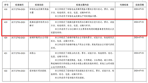 近日,工業(yè)和信息化部發(fā)布了 2023年第38號公告,由江蘇省盱眙凹凸棒石黏土行業(yè)協(xié)會、中國科學院蘭州化學物理研究所和江蘇神力特生物科技股份有限公司等單位聯(lián)合制定的建材行業(yè)標準 JC/T 2791-2023《脫毒抗菌材料用凹凸棒石》獲批,將于 2024年7月1日正式實施。