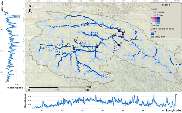 小頭高原魚的全局相對(duì)資源量/棲息地適合度(Global relative biomass/Hglobal)和局部絕對(duì)資源密度(Dlocal in g/m2)