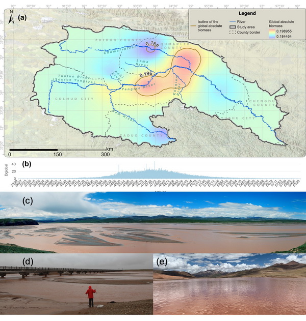 (a)小頭高原魚全局絕對(duì)資源密度(g/m2)及其與海拔的關(guān)系(b);(c、d)資源分布冷點(diǎn)區(qū)辮狀河流典型生境;(e)資源分布熱點(diǎn)區(qū)高原峽谷型生境