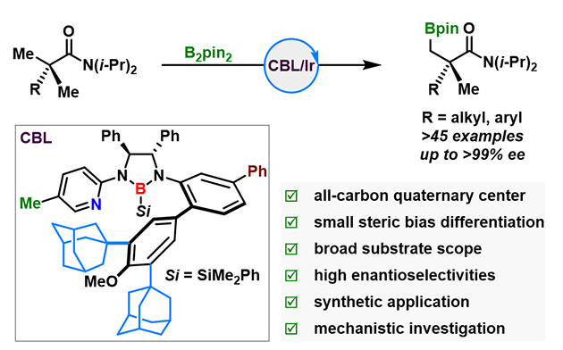 近日,該團隊針對不對稱碳-氫鍵活化在構建手性季碳中心的挑戰(zhàn)性難題,利用手性 CBL的多位點協(xié)同調控策略,高對映選擇性地實現(xiàn)了偕二甲基類化合物的去對稱化碳-氫鍵硼化反應。
