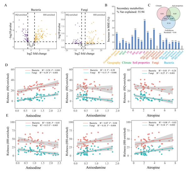 環(huán)境因子對山莨菪根部莨菪烷類生物堿含量的影響。(A) 利用edgeR分析鑒定不同區(qū)域差異OTUs;(B) 基于隨機森林分析的環(huán)境因子對莨菪烷類生物堿含量的影響;(C) 方差分解探究氣候因子、土壤因子和微生物對莨菪烷類生物堿變異的貢獻(xiàn);(D)橫斷山-祁連山區(qū)域富集的內(nèi)生真菌與莨菪烷類生物堿含量的回歸分析;(E)橫斷山-喜馬拉雅山區(qū)域富集的內(nèi)生真菌與莨菪烷類生物堿含量的回歸分析