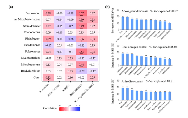 (a) 細(xì)菌主要屬與莨菪烷類生物堿含量、地上生物量和氮含量之間的相關(guān)性分析; (b) 基于隨機森林分析的影響樟柳堿含量、地上生物量和氮含量的屬排名