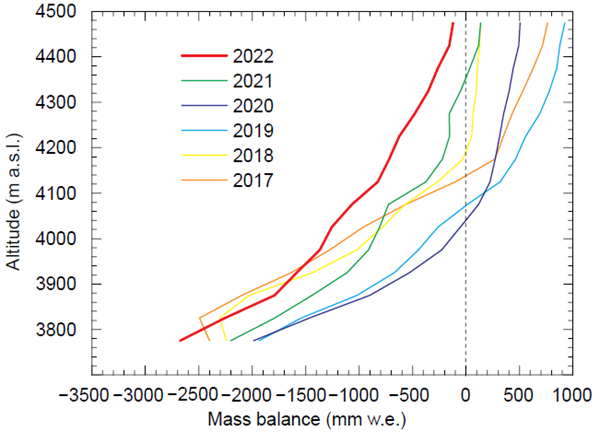 研究發(fā)現(xiàn),2022年烏源1號冰川的年物質平衡為-1251mm,略高于2010年的歷史最低值,但其夏季物質平衡達到了觀測記錄以來的最低值,為-1503 mm,表明2022年夏季是烏源1號冰川有記錄以來物質虧損量最大的一年(圖1)。