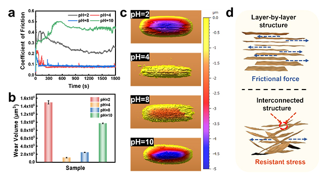 研究人員采用M Xene凝膠作為潤(rùn)滑劑,通過(guò)對(duì)體系 中pH的控制,實(shí)現(xiàn)了其潤(rùn)滑性能的突變。摩擦測(cè)試表明, pH4凝膠的摩擦系數(shù)可降至 0.1以下, 較pH10降低了約0.35,同時(shí),磨損體積也有大幅降低,表現(xiàn)出優(yōu)異的減摩抗磨性能,這種現(xiàn)象主要?dú)w因于不同 pH下凝膠拓?fù)浣Y(jié)構(gòu)的差異。