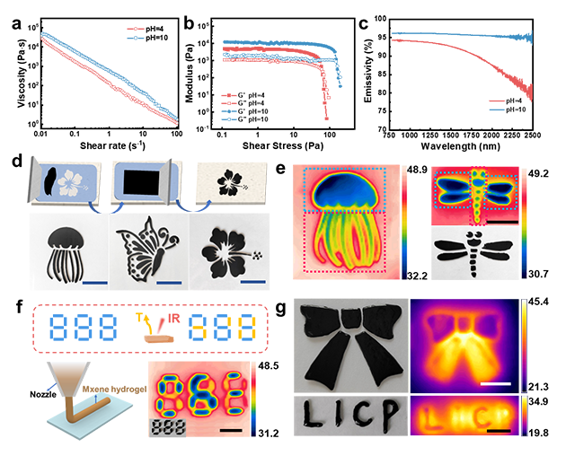 基于 MXene凝膠適宜的流變學(xué)行為,將其作為墨水用于涂布和擠出打印。研究發(fā)現(xiàn)凝膠的紅外發(fā)射率和紅外光熱轉(zhuǎn)化效率受其表面基團(tuán)及內(nèi)部結(jié)構(gòu)的影響,故不同pH下的凝膠表現(xiàn)出非一致的熱屏蔽和光熱轉(zhuǎn)化能力。基于此,凝膠在信息加密和紅外防偽等領(lǐng)域表現(xiàn)出出色的潛在應(yīng)用價(jià)值。