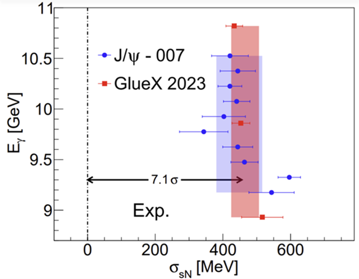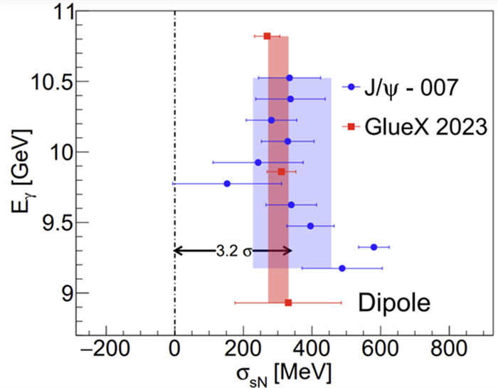 通過(guò)建立質(zhì)子的量子反常能與總西格瑪項(xiàng)(包括輕夸克和重夸克對(duì)質(zhì)子質(zhì)量的貢獻(xiàn))之間的關(guān)系,近代物理所研究團(tuán)隊(duì)從矢量介子在近質(zhì)量閾處的光生微分截面實(shí)驗(yàn)數(shù)據(jù)中提取了西格瑪項(xiàng)的值。結(jié)果顯示,重夸克的西格瑪項(xiàng)值比人們之前的預(yù)期要大,約為337兆電子伏特(偶極子擬合)和455兆電子伏特(指數(shù)擬合),約占整個(gè)質(zhì)子質(zhì)量(938兆電子伏特)的36~48%。指數(shù)擬合結(jié)果不為零的顯著度達(dá)到了大約7個(gè)標(biāo)準(zhǔn)差。此外,研究中使用的實(shí)驗(yàn)數(shù)據(jù)來(lái)自?xún)蓚€(gè)不同的合作組,團(tuán)隊(duì)利用Kolmogorov–Smirnov檢驗(yàn)方法發(fā)現(xiàn)從兩組數(shù)據(jù)中提取的西格瑪項(xiàng)值是兼容的。