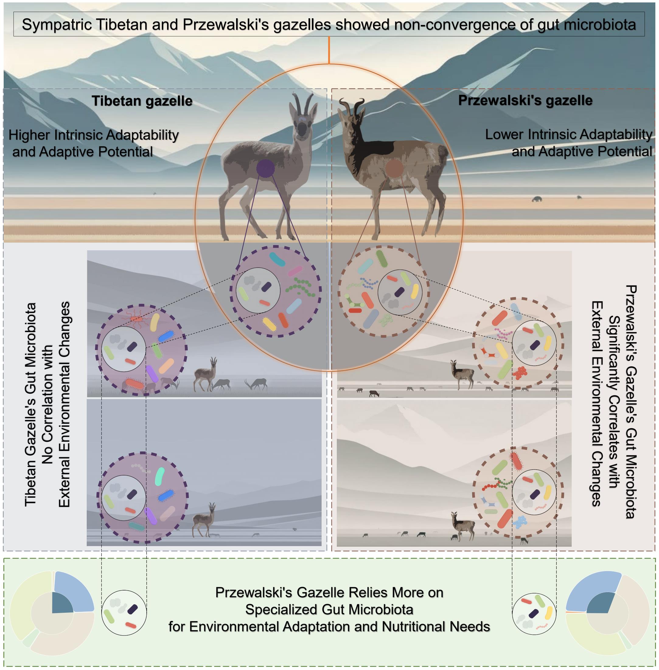 為闡明宿主瀕危程度與腸道微生物依賴性之間的關(guān)系,中國科學(xué)院西北高原生物研究所動物生態(tài)與資源保護研究團隊以藏原羚(近危)和普氏原羚(瀕危)為研究對象,通過16S rRNA擴增子測序技術(shù)進行高通量測序,深入探究了這兩個物種在相同和不同環(huán)境條件下的腸道微生物多樣性和組成,群落組裝機制以及預(yù)測功能的變化。研究結(jié)果表明,相較于異域分布的種群,同域分布的藏原羚和普氏原羚種群的腸道微生物多樣性和組成并未因共享相同環(huán)境而呈現(xiàn)顯著的趨同。進一步分析發(fā)現(xiàn),藏原羚和普氏原羚腸道微生物與宿主外部環(huán)境變化的關(guān)系存在明顯的區(qū)別,瀕危等級更高的普氏原羚腸道微生物群落結(jié)構(gòu)變異與環(huán)境條件的改變顯著相關(guān),而在瀕危等級較低的藏原羚中,這種相關(guān)性則不顯著。利用iCAMP對兩物種腸道微生物群落的組裝過程進行定量分析,結(jié)果顯示普氏原羚腸道微生物群落的組裝過程相比藏原羚更偏向于同質(zhì)選擇過程(HoS)。對促進這一轉(zhuǎn)變的微生物類群進行分析,發(fā)現(xiàn)在普氏原羚中貢獻了同質(zhì)選擇,但在藏原羚中貢獻了其他過程(如隨機漂變、擴散限制、異質(zhì)分散或異質(zhì)選擇)的ASVs主要隸屬于顫螺旋菌科、coprostanoligenes group、克里斯滕森菌科、阿克曼氏菌科和拉克諾斯菌科。對這些ASVs進行功能預(yù)測及KEGG富集分析,結(jié)果表明,其主要與營養(yǎng)物質(zhì)代謝、合成以及免疫調(diào)節(jié)密切相關(guān),提示這些ASVs可能在宿主營養(yǎng)物質(zhì)利用和免疫功能維持等方面發(fā)揮著重要作用。研究認為瀕危等級較高的普氏原羚更依賴腸道微生物所提供的“生態(tài)系統(tǒng)服務(wù)”以應(yīng)對環(huán)境的變化。這種依賴性可能源于瀕危物種通常適應(yīng)性和適應(yīng)潛力較低,腸道微生物在其適應(yīng)和應(yīng)對環(huán)境變化中發(fā)揮了重要的補償作用。本研究在揭示宿主瀕危程度與腸道微生物依賴性的關(guān)系的同時,也為瀕危物種保護和管理提供了新的視角和策略。