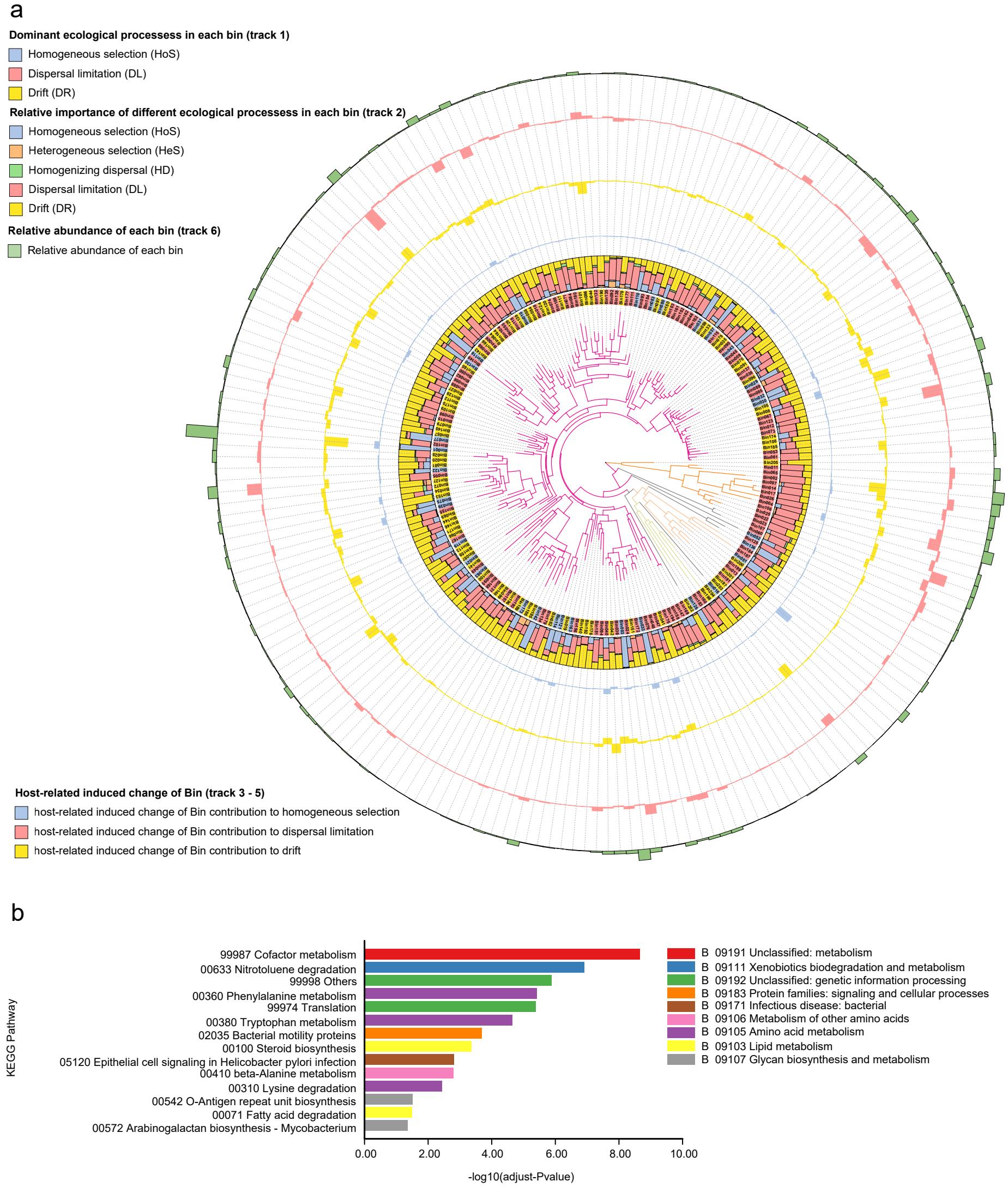 藏原羚和普氏原羚腸道微生物不同系統(tǒng)發(fā)育分箱的生態(tài)學(xué)組裝過程(a)及在普氏原羚腸道微生物中貢獻了同質(zhì)選擇過程而在藏原羚中卻貢獻了其他生態(tài)學(xué)組裝過程的ASVs集合所進行的KEGG富集分析(b)