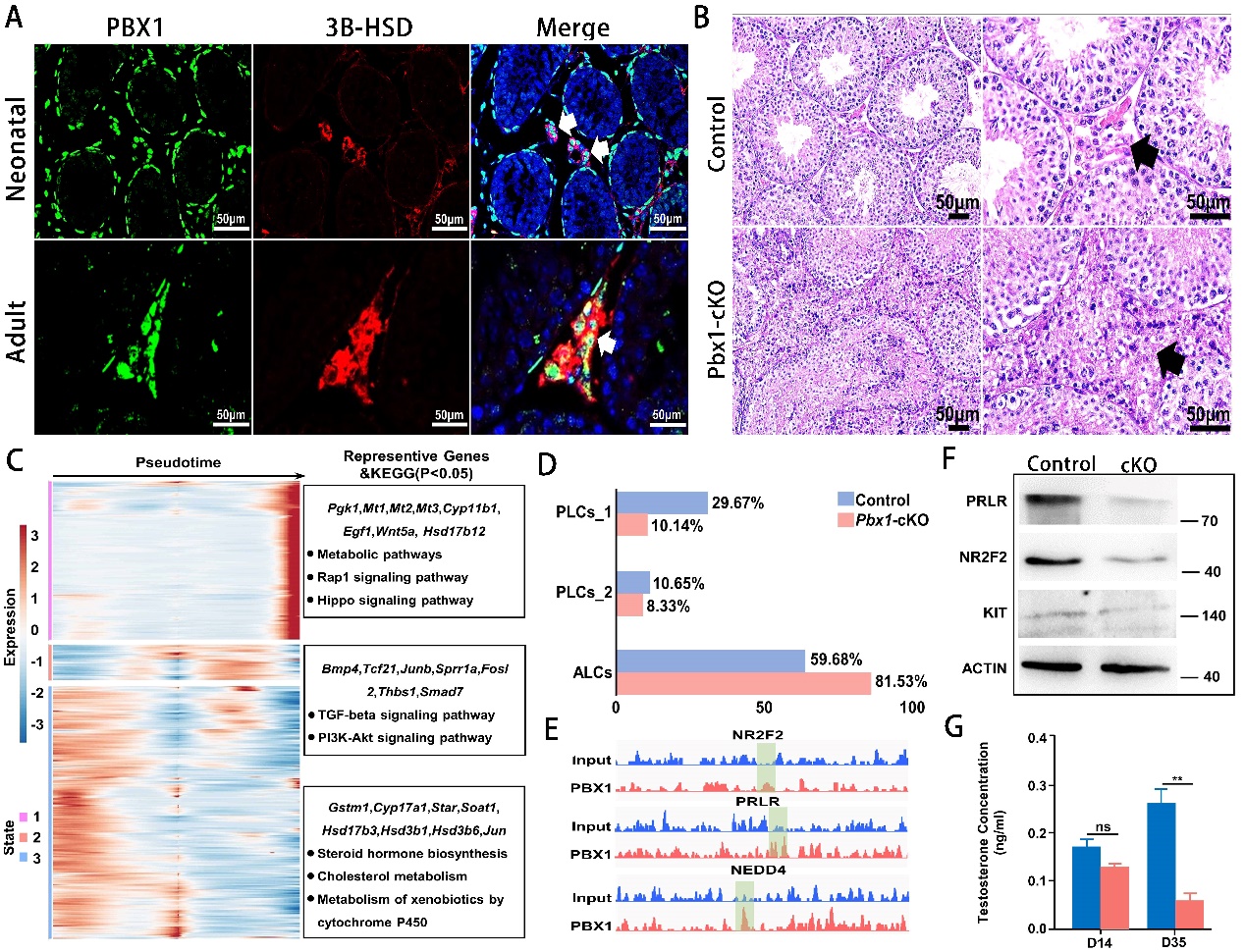 論文代表圖:A:轉(zhuǎn)錄因子PBX1在小鼠間質(zhì)細胞表達;B:間質(zhì)細胞特異性敲除Pbx1導(dǎo)致曲精小管結(jié)構(gòu)完整性受損;C:Pbx1敲除導(dǎo)致間質(zhì)細胞基因表達異常;D: Pbx1敲除導(dǎo)致不同類型間質(zhì)細胞比例異常;E:ChIP-seq結(jié)果顯示PBX1和Nr2f、Prlp、Nedd4等類固醇合成關(guān)鍵基因的啟動子區(qū)結(jié)合;F:Nr2f、Prlp、Kit蛋白在Pbx1敲除間質(zhì)細胞的表達水平低于對照;G:Pbx1敲除小鼠睪酮水平顯著降低。
