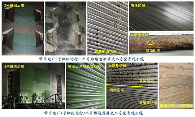 中國科學院蘭州化學物理研究所低碳能源材料組高祥虎研究員團隊近年來圍繞電站關(guān)鍵材料,專注于大型電站鍋爐輻射受熱面防護與節(jié)能增效關(guān)鍵技術(shù)研究。團隊研發(fā)的納米高熵防護與節(jié)能增效陶瓷涂層,突破了陶瓷材料防結(jié)焦、耐高溫腐蝕、紅外增效、高導熱率、熱膨脹系數(shù)可調(diào)等關(guān)鍵技術(shù),同時具有降低煤耗、提高煤種適應性的多功能特點,可滿足大型調(diào)峰電站及其他常規(guī)電站的使用需求。在常樂電廠的大力支持下,該材料先后在其2號、4號機組開展應用。在爐膛服役1年后,使用了涂層材料的水冷壁管壁表面光滑致密、無結(jié)焦、附著物易清除、未出現(xiàn)凹坑和管壁減薄等腐蝕情況,表現(xiàn)出優(yōu)異的耐高溫腐蝕和防結(jié)焦性能。經(jīng)西安熱工研究院有限公司現(xiàn)場檢測,管壁厚度較噴涂前無明顯變化。對照相同區(qū)域未噴涂防護涂層的水冷壁表面均出現(xiàn)明顯的腐蝕凹坑,并附著有褐色的腐蝕產(chǎn)物。