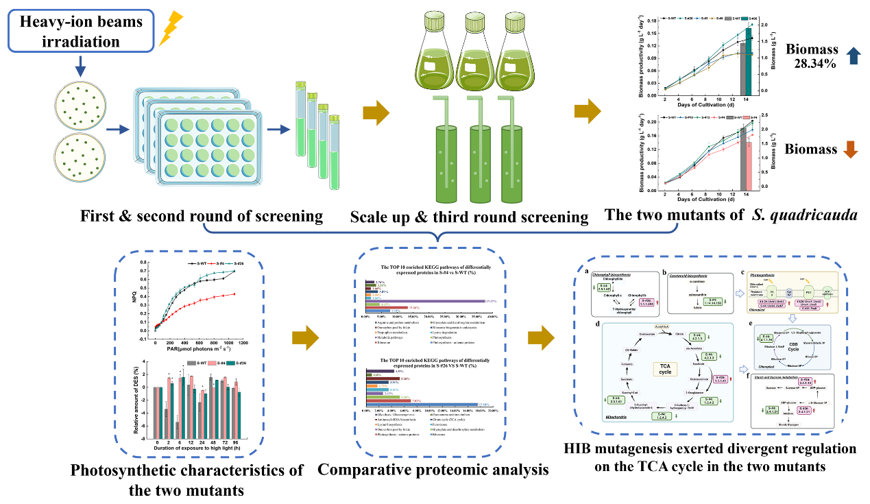 科研人員利用蘭州重離子研究裝置(HIRFL)提供的碳離子束,對(duì)環(huán)境適應(yīng)性強(qiáng)的四尾柵藻進(jìn)行了誘變選育,獲得了兩株光合特性、固碳能力與野生型對(duì)比鮮明的突變株;其中高固碳能力突變株生物量積累高于野生型的28.34?。?span lang="zh-CN" style="margin-top: 12px; margin-bottom: 12px; line-height: 1.5em; font-family: arial, helvetica, sans-serif; font-size: 16px;" data-index="9">,并且表現(xiàn)出對(duì)長(zhǎng)時(shí)間高光脅迫的適應(yīng)性。通過對(duì)兩株突變株光合特征與比較蛋白組學(xué)的關(guān)聯(lián)分析,科研人員發(fā)現(xiàn)重離子束輻射誘導(dǎo)的中心碳代謝差異蛋白對(duì)突變株固碳能力強(qiáng)弱起到重要調(diào)控作用;另外,與突變株固碳能力關(guān)聯(lián)的三羧酸循環(huán)差異調(diào)控,為高效固碳微藻工程株選育提供了潛在靶點(diǎn)。