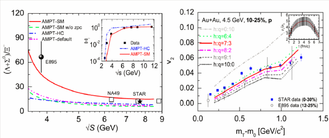 圖1.?多相輸運計算的單-雙奇異重子比值(左)以及質(zhì)子橢圓流(右)與實驗數(shù)據(jù)的比較