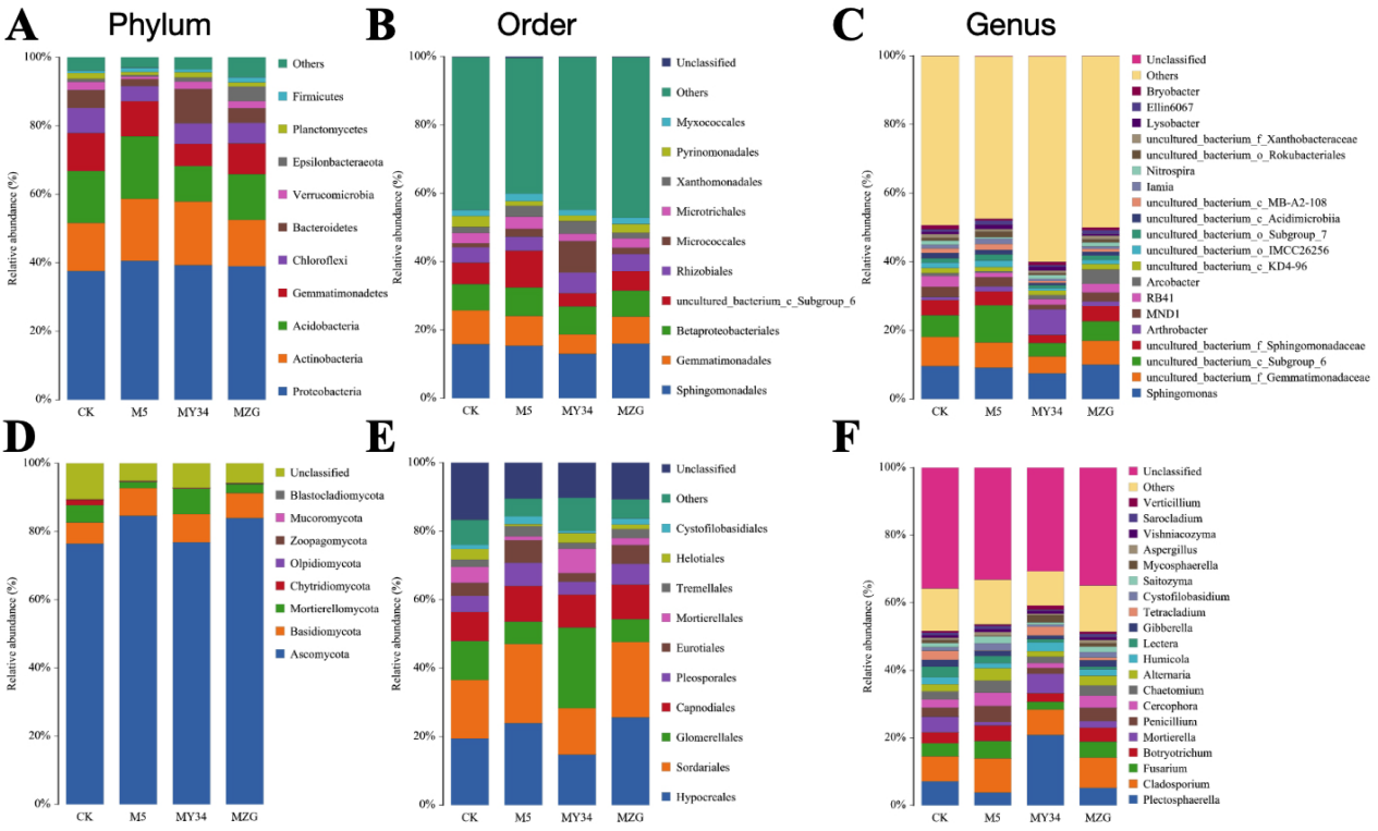 此外,根際微生物組結(jié)果表明,三種施用方式均不顯著改變微生物群落結(jié)構(gòu),但M5和MZG土壤中更易富集有益微生物,如青霉菌;而MY34更易富集嗜糖微生物,如Arthrobacter屬細菌和Plectosphaerella、Mortierella屬真菌。