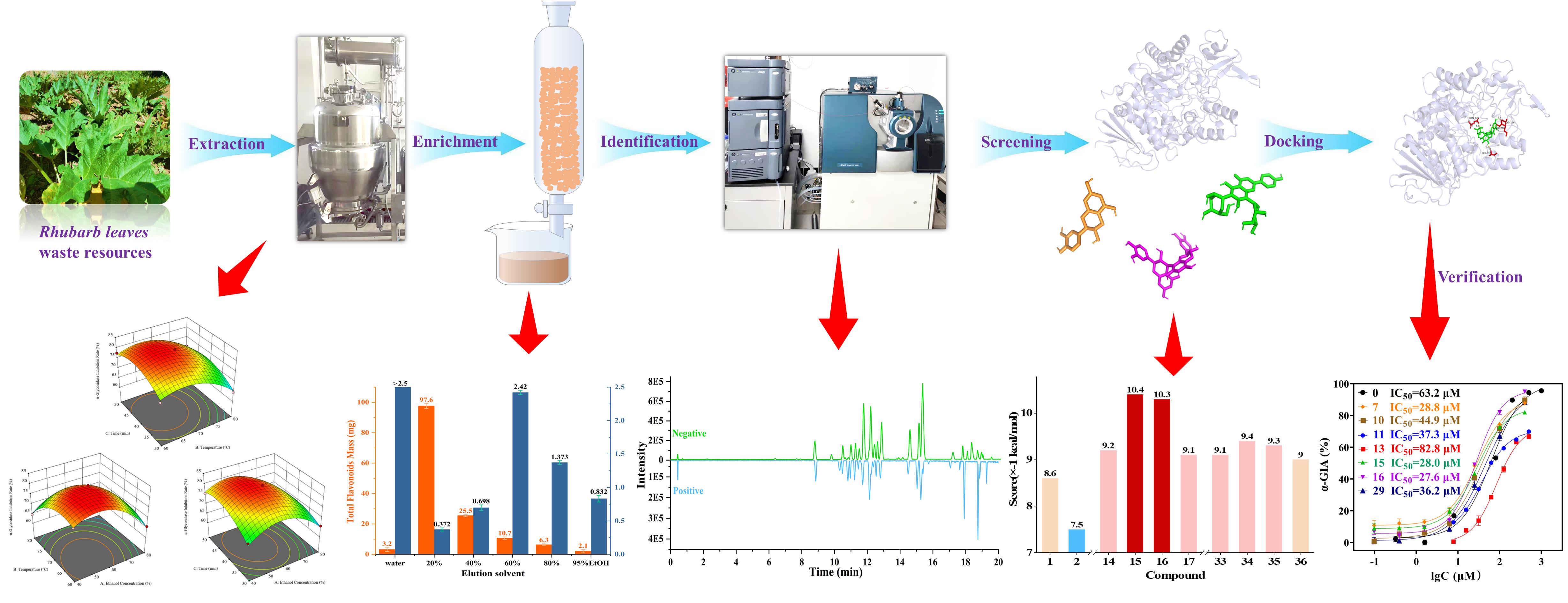 中國科學(xué)院西北高原生物研究所高原藏藥資源質(zhì)控與藥理毒理評價研究團隊以α-葡萄糖苷酶抑制活性作為關(guān)鍵評價指標(biāo),建立了基于大孔吸附樹脂富集、UPLC-QTOF-MS/MS分析表征、分子對接、體外驗證的唐古特大黃葉中α-葡萄糖苷酶抑制劑的系統(tǒng)篩選策略,篩選得到myricitrin、rumarin等6個α-葡萄糖苷酶抑制劑。基于穩(wěn)態(tài)、同步、三維熒光光譜和遠(yuǎn)紫外圓二色譜等多光譜技術(shù)的對接機制研究表明,6個抑制劑均能與α-葡萄糖苷酶發(fā)生結(jié)合并改變靶蛋白的酪氨酸和色氨酸殘基微環(huán)境,通過降低靶蛋白α-螺旋或β-轉(zhuǎn)角等二級結(jié)構(gòu)的含量從而導(dǎo)致蛋白酶失活,該研究為唐古特大黃廢棄資源的利用提供了新的見解。