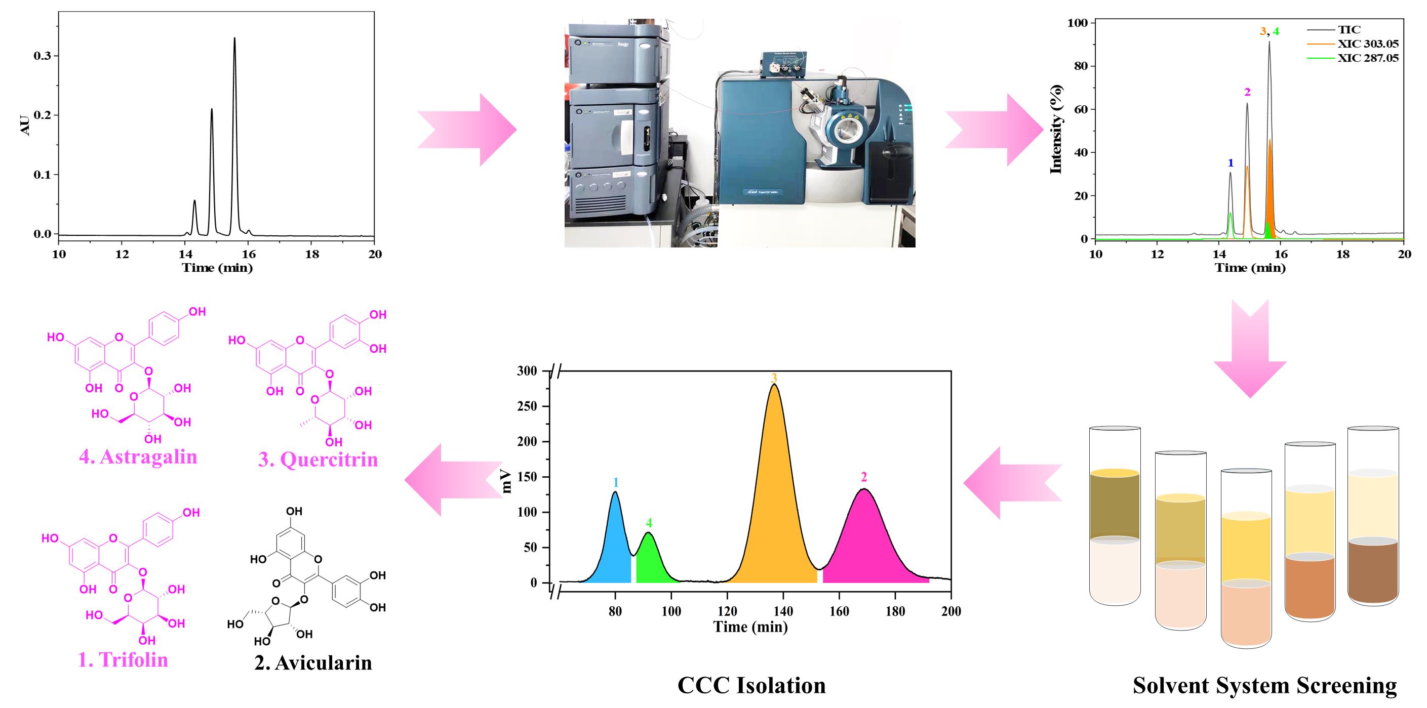 另外,由于天然產(chǎn)物組成成分和結(jié)構(gòu)復(fù)雜多樣,常常會出現(xiàn)色譜共洗脫現(xiàn)象,難以被發(fā)現(xiàn)、分析和分離。針對這一挑戰(zhàn),研究團隊提出一種基于UPLC-QTOF-MS/MS和CCC的HPLC共洗脫異構(gòu)體的差異識別和靶向分離策略。通過UPLC-QTOF-MS/MS實現(xiàn)了對共洗脫異構(gòu)體的差異特征精確識別和準(zhǔn)確定量,解決了共洗脫異構(gòu)體無法進行CCC溶劑系統(tǒng)篩選的關(guān)鍵技術(shù)問題?;诖瞬呗?,成功從唐古特大黃葉中分離得到astragalin等四種高純度的黃酮類化合物,其中三個互為異構(gòu)體。該研究為天然產(chǎn)物分離過程中共洗脫異構(gòu)體的分析和分離提供了新的思路。