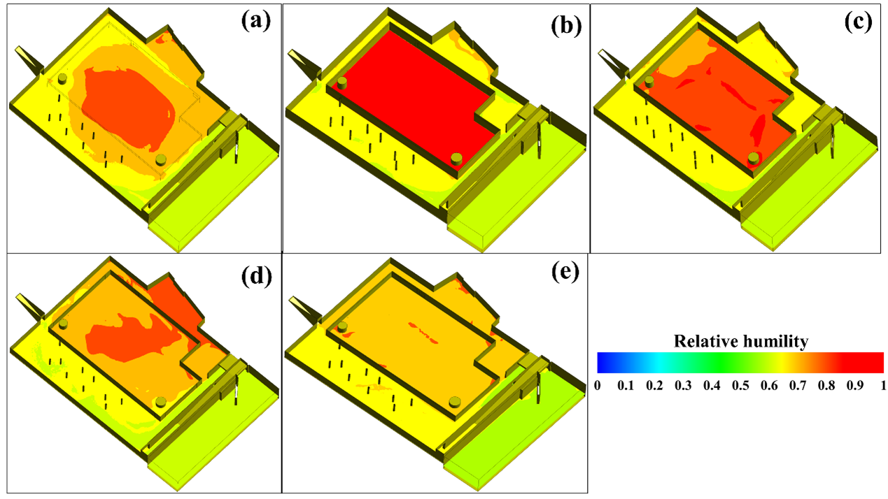 圖3? 5個不同改造階段遺址內(nèi)部的相對濕度分布:(a)I階段;(b)II階段;(c)III階段;(d)IV階段;(e)V階段。