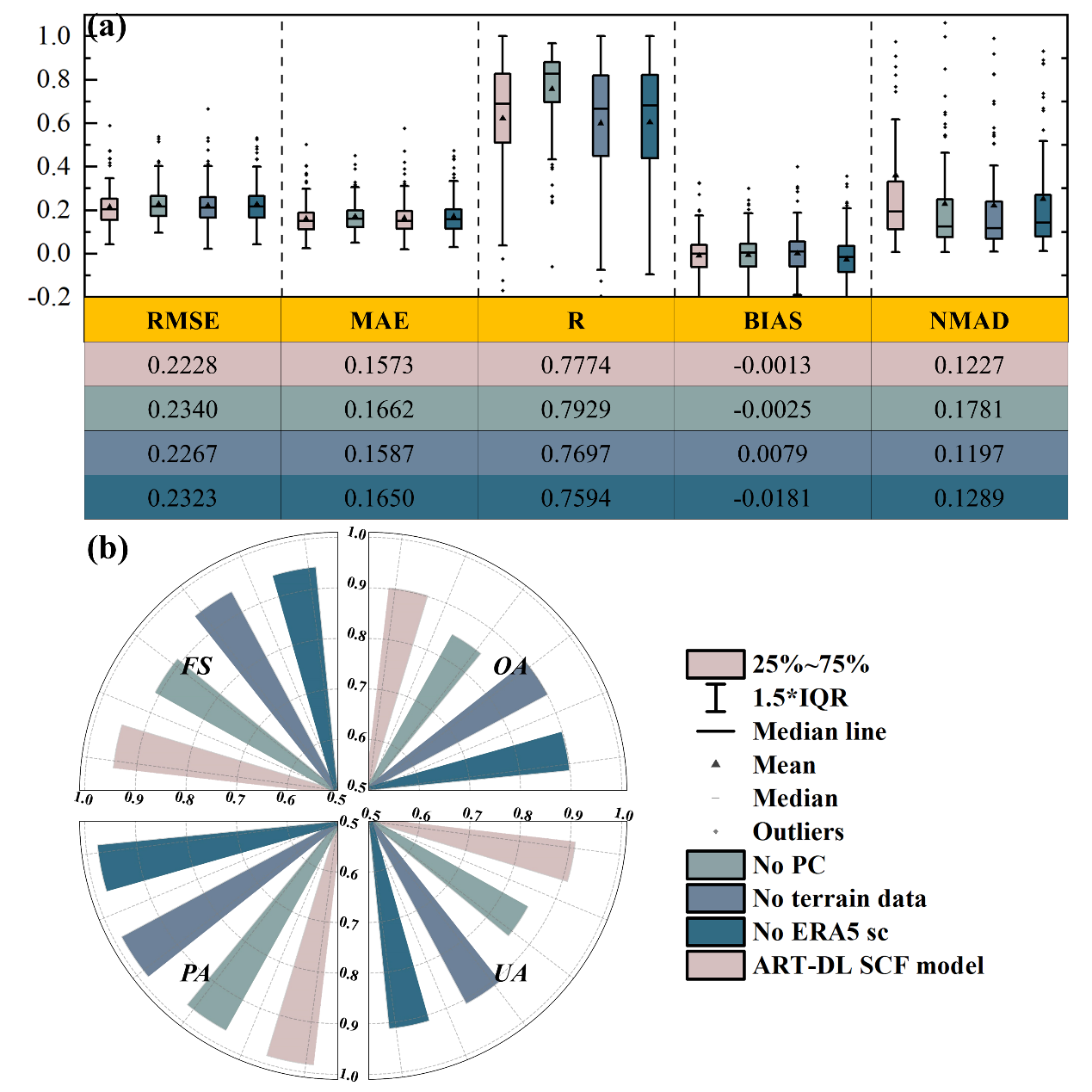 與Landsat參考SCF的綜合驗(yàn)證結(jié)果顯示,整體準(zhǔn)確率為90.20%,錯(cuò)分誤差和漏分誤差均在10%以下。值得注意的是,引入物理約束既提高了模型的準(zhǔn)確性和穩(wěn)定性,又減輕了低估問題。與沒有物理約束的模型相比,ART-DL SCF模型的均方根誤差顯著降低了4.79個(gè)百分點(diǎn),平均絕對(duì)誤差降低了5.35個(gè)百分點(diǎn)。這些準(zhǔn)確度明顯高于歐洲空間局 (ESA) 目前可用的 SnowCCI AVHRR產(chǎn)品。