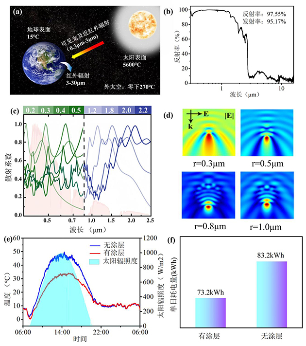 圖2. (a) 構建地球-太陽-外太空能源利用體系;(b) 輻射制冷涂層反射光譜;(c) 不同粒徑光學材料對0.5μm入射光的散射系數(shù)和(d) 電場分布;(e) 2024年8月18日06:00-19日06:00,太陽輻照度及儲能集裝箱表面溫度變化和(f) 空調制冷耗電量變化