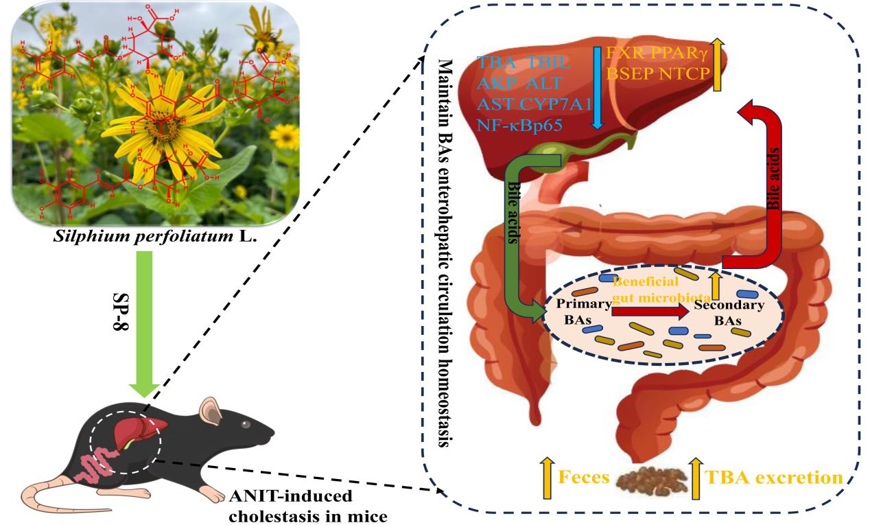 研究結(jié)果以?Caffeoylquinic acids from Silphium perfoliatum L. show hepatoprotective effects on cholestatic mice by regulating enterohepatic circulation of bile acids?為題,于9月30日在線發(fā)表于Journal of Ethnopharmacology(中國(guó)科學(xué)院二區(qū)期刊, 2023年影響因子/JCR分區(qū):4.8/Q1)。西北高原所與青海大學(xué)聯(lián)合培養(yǎng)的博士研究生張國(guó)英為第一作者,西北高原所趙曉輝研究員為通訊作者。同時(shí)該研究也申請(qǐng)了相關(guān)發(fā)明專利3件。該工作得到了青海省科技廳科技成果轉(zhuǎn)化專項(xiàng)和青海省“昆侖英才”人才計(jì)劃的資助和支持。