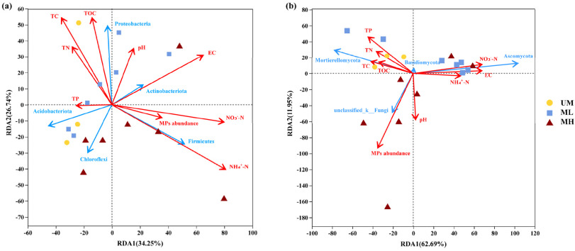 高通量測序分析表明,塑料圈中的α多樣性(Chao1和香農(nóng)指數(shù))低于土壤中的α多樣性,且隨土壤中微塑料豐度的變化而顯著不同。隨著微塑料豐度的增加,土壤中有機(jī)質(zhì)降解類群和光自養(yǎng)類群的比例也隨之增加,并顯示在塑料圈中富集。功能預(yù)測進(jìn)一步表明,微塑料的豐度影響了土壤的潛在功能,如與碳和氮循環(huán)相關(guān)的代謝途徑。與土壤環(huán)境相比,塑料圈中與有機(jī)物降解相關(guān)的功能豐度較高,且塑料圈的潛在健康風(fēng)險(xiǎn)更高。根據(jù)冗余(RDA)分析,可以確定環(huán)境理化性質(zhì)和微塑料豐度對真菌群落的影響大于對細(xì)菌群落的影響(圖3)。這表明,微塑料豐度會(huì)影響微生物多樣性組成,并可能影響土壤生態(tài)系統(tǒng)的整體性能。