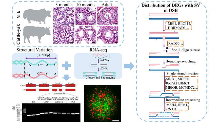 中國科學院西北高原生物研究所動物生態(tài)與資源保護研究團隊通過整合牦牛和普通牛基因組SV位點信息和轉(zhuǎn)錄組數(shù)據(jù),對牦牛、犏牛和回交一代(BC1)睪丸組織在幾個關(guān)鍵發(fā)育階段的組織學特征、轉(zhuǎn)錄組圖譜以及SV在差異表達基因(DEGs)中的分布進行了表征。結(jié)果發(fā)現(xiàn),在犏牛睪丸組織中,與精原細胞命運決定、減數(shù)分裂重組和DSB修復等過程相關(guān)的基因表達下調(diào),且在每個發(fā)育階段犏牛中均有一定比例的DEGs含有SV。比如,3月齡犏牛27.78%的DEGs(50/180)中分布有180個SV,其中大部分SV(147/180)位于內(nèi)含子區(qū);10月齡犏牛27.73%的DEGs(1750/6310)中分布有8741個SV,其中大部分SV位于內(nèi)含子區(qū)(7640/8741),少量的SV位于外顯子區(qū)(50/8741)和UTR區(qū)(18/8741)等,這些SV可能會影響基因的表達。對其中的候選基因ESCO2和BRDT進行了表達驗證,發(fā)現(xiàn)ESCO2在牦牛和犏牛精母細胞細線期表達,BRDT在牦牛精母細胞偶線期和粗線期表達,但在犏牛中只在偶線期表達。相較于牦牛,犏牛中ESCO2和BRDT的表達均下調(diào)。此外,還發(fā)現(xiàn)差異表達的X連鎖基因在10月齡(123/252)和成年(206/274)的犏牛中多數(shù)表達上調(diào),這可能與減數(shù)分裂性染色體失活(MSCI)異常有關(guān),凸顯了 X 染色體在雜交不育中的作用。然而,相較于犏牛無法產(chǎn)生精子,BC1曲細精管中出現(xiàn)了少量的圓形精子,并且與精子形成相關(guān)的基因(TSSK6, TSKS, TBC1D21, TPPP2, SPPL2C等)表達上調(diào),但仍低于牦牛正常精子發(fā)生水平,表明精子發(fā)生缺陷和基因表達異常在BC1中得到了部分恢復。本研究獲得了牦牛和犏牛在關(guān)鍵發(fā)育階段的DEGs 和SV位點信息,為了解SV在犏牛雄性不育以及物種雜交不育中的潛在功能提供了啟示。