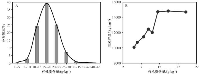 圖1? 河西走廊土壤有機(jī)質(zhì)含量及相同灌溉條件下玉米產(chǎn)量