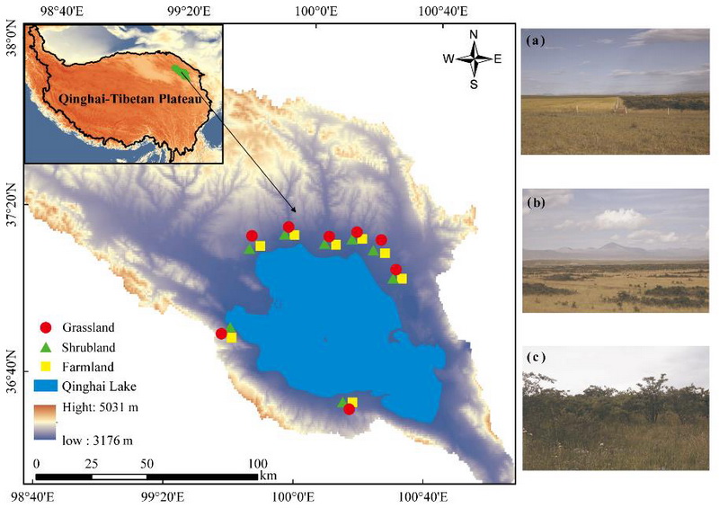 中國科學(xué)院西北高原生物研究所高原藥用資源生態(tài)保護(hù)與繁育學(xué)科團(tuán)隊(duì)在環(huán)青海湖區(qū)域分別選擇高寒草原、農(nóng)田、人工灌叢為研究對象,構(gòu)建了從天然草原—農(nóng)田—人工灌叢的土地利用類型轉(zhuǎn)化序列,測定了初級生產(chǎn)力、土壤真菌和細(xì)菌以及土壤因子。研究表明:隨著農(nóng)田向人工灌叢的轉(zhuǎn)化土壤環(huán)境因子和微生物群落組成呈現(xiàn)出逐漸向天然草地恢復(fù)的趨勢,土壤磷含量對土壤微生物群落組成的恢復(fù)發(fā)揮關(guān)鍵調(diào)節(jié)作用。退耕還林后土壤微生物共生網(wǎng)絡(luò)復(fù)雜性的恢復(fù)比微生物群落組成和功能類群的恢復(fù)需要更長的時(shí)間。最重要的是,本研究揭示了土壤微生物共生網(wǎng)絡(luò)復(fù)雜性在土地利用變化過程中介導(dǎo)初級生產(chǎn)力對土壤多功能性的影響。這些發(fā)現(xiàn)彌補(bǔ)了我們對咸水湖生境周圍土地利用變化過程認(rèn)識(shí)的不足,對于拓寬我們對土地利用變化的認(rèn)識(shí),促進(jìn)全球高寒生態(tài)系統(tǒng)恢復(fù)決策的制定具有重要意義。