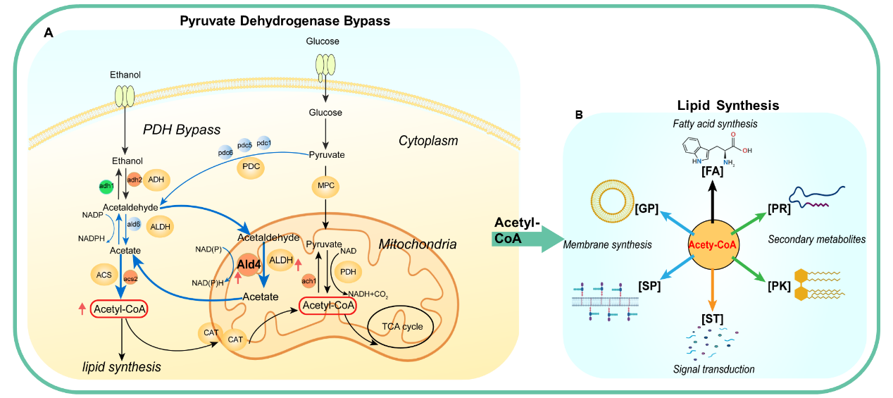 基于此現(xiàn)狀,科研人員利用蘭州重離子加速器(HIRFL)對(duì)目標(biāo)突變體實(shí)施多輪輻射,結(jié)合ALE技術(shù)提高了酵母的抗逆性和耐受性,因此獲得了適應(yīng)性更強(qiáng)的底盤(pán)細(xì)胞。再通過(guò)多組學(xué)聯(lián)合分析方法識(shí)別出與其發(fā)酵性能相關(guān)的重要基因,利用基因編輯技術(shù)對(duì)代謝通路進(jìn)行精準(zhǔn)優(yōu)化,著重優(yōu)化了核心代謝中間產(chǎn)物的代謝通量,使乙酰輔酶A水平較之前提高了17.10%,從而顯著提高了酵母在合成脂類(lèi)和其他高附加值化合物方面的產(chǎn)量。