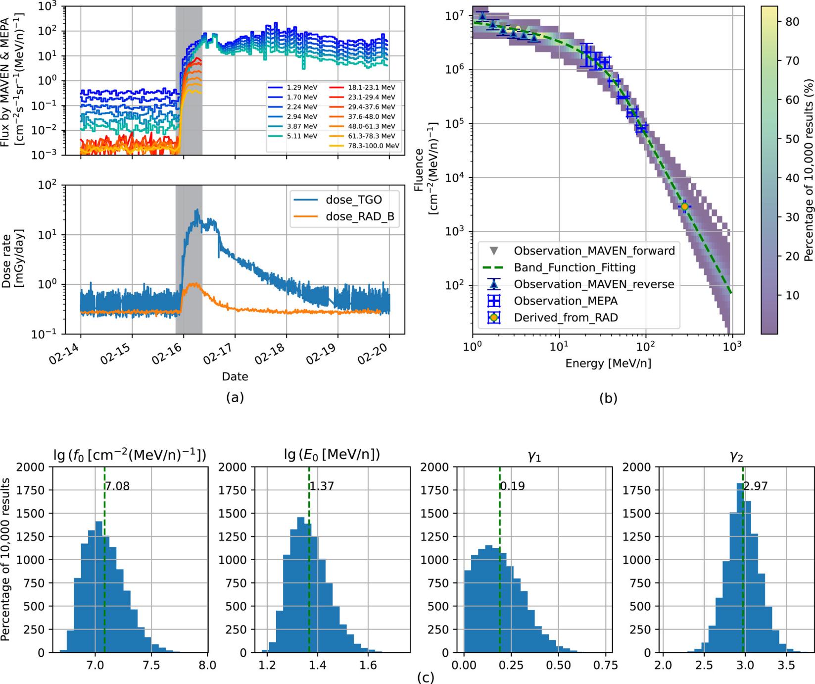 本研究使用了多個探測器數(shù)據(jù)來構(gòu)建相關(guān)質(zhì)子能譜。中低能段的質(zhì)子能譜由能量粒子分析儀和美國高能粒子儀提供。更高能段的質(zhì)子通量是團隊結(jié)合火星表面的輻射評估探測器和火星粒子傳輸模型模擬反演得到。研究團隊通過對上述觀測和反演的能譜進行擬合,得到了此次太陽高能粒子事件在火星空間1~1000MeV能量范圍內(nèi)的完整質(zhì)子能譜。