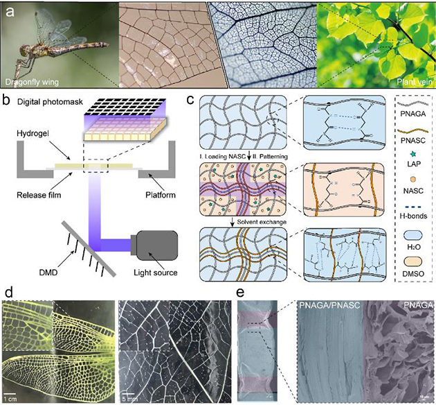 近日,中國(guó)科學(xué)院蘭州化學(xué)物理研究所潤(rùn)滑材料重點(diǎn)實(shí)驗(yàn)室受自然界中廣泛存在的圖案化異質(zhì)結(jié)構(gòu)(如昆蟲翅膀和植物葉脈等)啟發(fā),發(fā)展了一種圖案化水凝膠(CSN水凝膠)方案實(shí)現(xiàn)了其多屬性、寬范圍的力學(xué)性能調(diào)控。如圖1所示,研究人員以光固化聚(N-丙烯酰甘氨酰胺)(PNAGA)水凝膠作為軟基質(zhì),通過(guò)先浸泡N-丙烯酰基氨基脲(NASC)前驅(qū)體溶液再以選區(qū)曝光構(gòu)建圖案化硬骨架(PNAGA@PNASC),然后經(jīng)后續(xù)水平衡過(guò)程中的相轉(zhuǎn)化誘導(dǎo)氫鍵重構(gòu)實(shí)現(xiàn)軟基質(zhì)和硬骨架的無(wú)縫互鎖,發(fā)展了具有局部互穿網(wǎng)絡(luò)的圖案化硬骨架強(qiáng)化水凝膠。