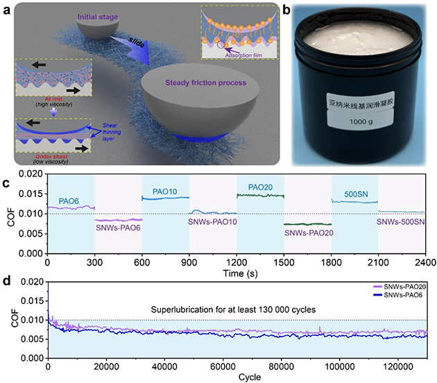 研究人員還利用剪切變稀的亞納米線材料的三維網(wǎng)絡(luò)結(jié)構(gòu),實(shí)現(xiàn)了多種基礎(chǔ)油的限域,發(fā)展了一系列半固態(tài)凝膠潤滑劑(圖2),進(jìn)一步提高了多種基礎(chǔ)油的潤滑性能,并在超過13萬次摩擦周期內(nèi)保持穩(wěn)定,展現(xiàn)其長期應(yīng)用的潛力。最為關(guān)鍵的是,通過在實(shí)驗(yàn)室中擴(kuò)大原料比例,可成功制備千克級產(chǎn)品,展現(xiàn)出其在工業(yè)應(yīng)用中的潛力。除此之外,基于亞納米線與PAO6潤滑油復(fù)配制備的潤滑劑還實(shí)現(xiàn)了鋼-鋼界面的減摩抗磨,極大提高了PAO6潤滑油的潤滑性能及承載性能。相關(guān)研究成果發(fā)表在ACS Nano(2024,DOI:10.1021/acsnano.4c12703)上,蘭州化物所博士生王劉程和張立強(qiáng)助理研究員為論文共同第一作者,王道愛研究員為通訊作者。