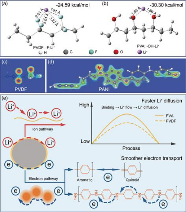 針對(duì)電化學(xué)吸附過(guò)程中電極內(nèi)Li+擴(kuò)散速率和電子轉(zhuǎn)移速率不匹配,從而制約電極電化學(xué)活性的問題,設(shè)計(jì)和制備了離子和電子雙導(dǎo)聚(乙烯醇)-聚苯胺(PVA-PANI)共聚物(CP),并包覆到吸附劑顆粒表面,促進(jìn)Li+擴(kuò)散和電子轉(zhuǎn)移,實(shí)現(xiàn)吸附效率的提高。HMO@CP電極具有優(yōu)越的電化學(xué)活性和吸附效率,吸附容量高達(dá)49.48 mg/g。機(jī)理研究表明,PVA中帶負(fù)電荷的羥基(-OH)可以富集Li+并加速Li+的擴(kuò)散,PANI中的共軛結(jié)構(gòu)和氧化還原活性醌類位點(diǎn)提供了更密集的電子分布促進(jìn)電子轉(zhuǎn)移(圖1)。該工作以離子擴(kuò)散和電子轉(zhuǎn)移為出發(fā)點(diǎn),以提高離子擴(kuò)散速率和電子轉(zhuǎn)移速率匹配度為導(dǎo)向,實(shí)現(xiàn)吸附效率的提高(ACS Nano,18?。?024) 31204-31214)。