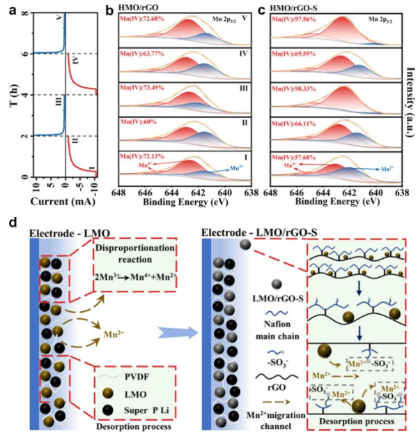 除離子傳輸效率外,針對(duì)錳基電活性材料因電極極化導(dǎo)致的穩(wěn)定性較差的問題,采用還原氧化石墨烯(rGO)與Nafion協(xié)同改性的策略制備得到高效穩(wěn)定電化學(xué)吸附材料。rGO在增加材料分散性的同時(shí)大幅降低了材料極化,緩解極化過(guò)程帶來(lái)的容量衰減,使得吸附容量和循環(huán)穩(wěn)定性得到提升。研究表明Nafion通過(guò)主鏈與還原氧化石墨烯表面羧基結(jié)合,而支鏈磺酸基團(tuán)(-SO3-)可以捕獲因歧化反應(yīng)溶出的Mn2+,從而使得材料表面局部Mn2+濃度升高(圖2)。經(jīng)過(guò)協(xié)同改性,材料30次循環(huán)容量保持率由79.04%提升至94.64%。該研究驗(yàn)證了離子捕獲機(jī)制抑制歧化反應(yīng)的可行性,能夠?yàn)殄i系材料在電化學(xué)分離過(guò)程中的溶損問題提供新的解決思路(Chem. Eng. J,497 (2024) 155009)。