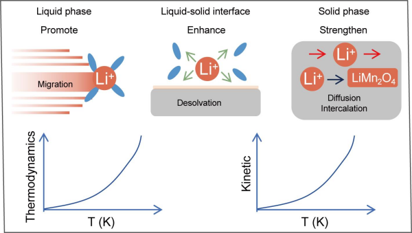 在材料改性的基礎(chǔ)上,青海鹽湖研究所科研人員針對(duì)環(huán)境溫度影響電化學(xué)吸附熱力學(xué)和動(dòng)力學(xué)研究不夠深入的問題,開展了逐步升溫的策略(273.15到328.15 K),探究了溫度如何影響液相中水合離子遷移,固液界面離子脫水合和電子轉(zhuǎn)移,固相中離子擴(kuò)散等行為的熱力學(xué)和動(dòng)力學(xué)(圖3)。該研究通過(guò)升溫強(qiáng)化了熱力學(xué)和動(dòng)力學(xué),使吸附速率和吸附容量改善,且通過(guò)調(diào)節(jié)反應(yīng)參數(shù)優(yōu)化反應(yīng)速率的策略也可用于電池、催化合能源等領(lǐng)域(Sep. Purif. Technol.355?。?025) 129631)。